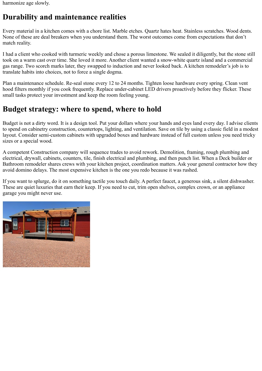 Sustainability that feels natural Longevity itself is sustainable. A kitchen that doesn’t need a refresh every five years is kinder to the planet. Beyond that, choose low-VOC finishes, LED lighting, and appliances with real energy performance. Induction reduces indoor combustion byproducts, which is good for lungs and paint. Reuse existing cabinets if they have solid boxes, and swap doors and hardware. I have worked with Carpenters who saved clients tens of thousands by reconfiguring a few boxes and adding new faces, then put the savings into better lighting and ventilation. Salvage is worth a look. Old breadboards, antique pulls, or a reclaimed wood island top add soul without reading trendy. The trick is proportion: one or two pieces, used with restraint. Sustainability also looks like optimized sourcing. A Construction company Kanab will often have relationships with regional suppliers that cut lead times and reduce shipping miles. It’s worth asking. Regional considerations and climate What ages well in a mountain climate might differ from a coastal home. In dry high-desert regions, wood movement can be dramatic. I have seen cabinet doors shrink a hair in winter and swell in monsoon season. Good hardware and stable species help. In humid zones, finishes need to resist moisture and mold. Tile floors might make more sense than wood if your house opens to a pool. Sun exposure matters. A south-facing kitchen in Utah will bake certain finishes and yellow some whites faster. Choose UV-stable topcoats and fabrics. If your windows welcome windblown dust, opt for fewer deep open shelves and more wipeable surfaces. These aren’t style choices; they are longevity plays. Two field-tested checklists Five layout checks before you order cabinets: Is there a landing spot within one step of the fridge, oven, and sink? Do dishwasher and trash pull-out open without blocking each other? Can two people work without crossing paths at the range? Is the primary prep space at least 30 inches wide with lighting above? Does the aisle width fit the household? 42 inches for a single cook, 48 for two is a good rule. Four maintenance habits that keep a kitchen young: Reseal stone on a schedule and wipe spills promptly.