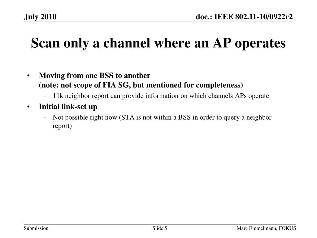 Scan only a channel where an AP operates • Moving from one BSS to another(note: not scope of FIA SG, but mentioned for completeness) • 11k neighbor report can provide information on which channels APs operate • Initial link-set up • Not possible right now (STA is not within a BSS in order to query a neighbor report) Marc Emmelmann, FOKUS