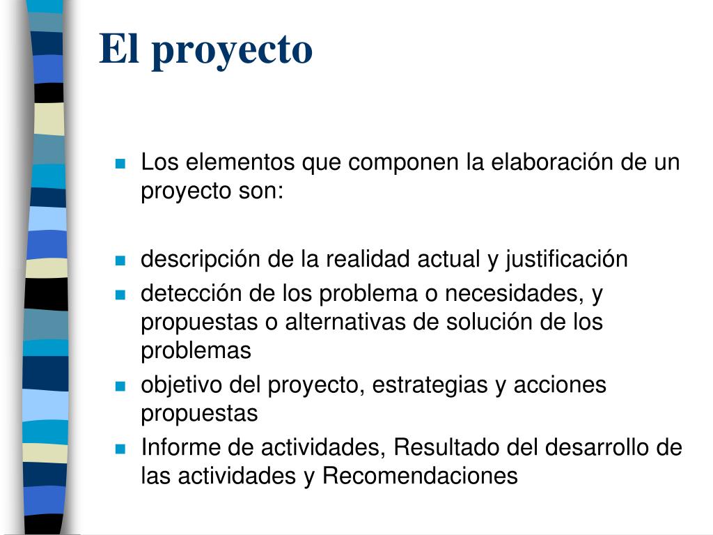 El proyecto • Los elementos que componen la elaboración de un proyecto son: • descripción de la realidad actual y justificación • detección de los problema o necesidades, y propuestas o alternativas de solución de los problemas • objetivo del proyecto, estrategias y acciones propuestas • Informe de actividades, Resultado del desarrollo de las actividades y Recomendaciones