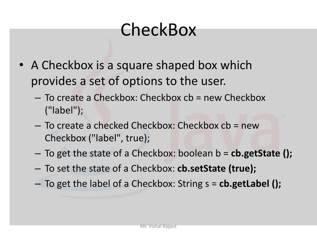 CheckBox • A Checkbox is a square shaped box which provides a set of options to the user. • To create a Checkbox: Checkbox cb = new Checkbox ("label"); • To create a checked Checkbox: Checkbox cb = new Checkbox ("label", true); • To get the state of a Checkbox: boolean b = cb.getState (); • To set the state of a Checkbox: cb.setState (true); • To get the label of a Checkbox: String s = cb.getLabel (); Mr. Vishal Rajput