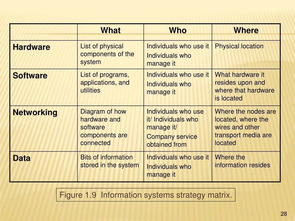 The plan an organization uses in providing information services. IS allows business to implement its business strategy. IS helps determine the company’s capabilities. Four key IS infrastructure components are key to IS strategy (Figure 1.9) These key components are sufficient to allow the general manager to assess critical IS issues. IS Strategy