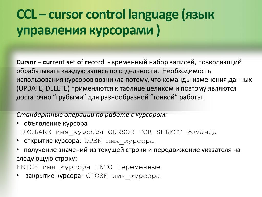 CCL – cursor control language (язык управления курсорами ) • Cursor – current set of record - временный набор записей, позволяющий обрабатывать каждую запись по отдельности. Необходимость использования курсоров возникла потому, что команды изменения данных (UPDATE, DELETE) применяются к таблице целиком и поэтому являются достаточно “грубыми” для разнообразной “тонкой” работы. • Стандартные операции по работе с курсором: • объявление курсора • DECLARE имя_курсора CURSOR FOR SELECT команда • открытие курсора: OPEN имя_курсора • получение значений из текущей строки и передвижение указателя на следующую строку: • FETCH имя_курсора INTO переменные • закрытие курсора: CLOSE имя_курсора