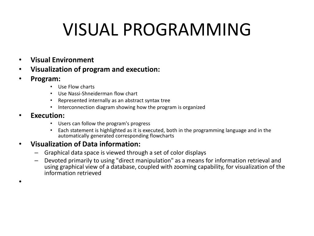 VISUAL PROGRAMMING • Visual Environment • Visualization of program and execution: • Program: • Use Flow charts • Use Nassi-Shneiderman flow chart • Represented internally as an abstract syntax tree • Interconnection diagram showing how the program is organized • Execution: • Users can follow the program's progress • Each statement is highlighted as it is executed, both in the programming language and in the automatically generated corresponding flowcharts • Visualization of Data information: • Graphical data space is viewed through a set of color displays • Devoted primarily to using "direct manipulation" as a means for information retrieval and using graphical view of a database, coupled with zooming capability, for visualization of the information retrieved