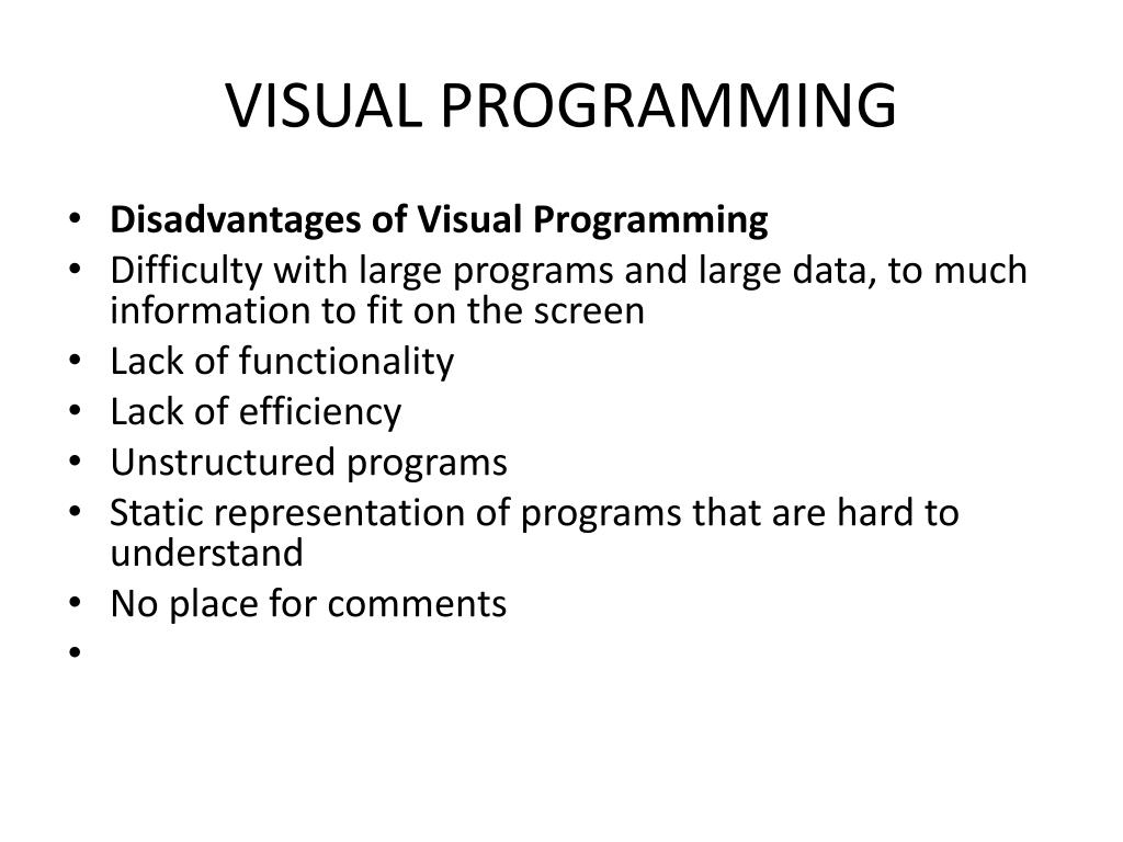 VISUAL PROGRAMMING • Disadvantages of Visual Programming • Difficulty with large programs and large data, to much information to fit on the screen • Lack of functionality • Lack of efficiency • Unstructured programs • Static representation of programs that are hard to understand • No place for comments