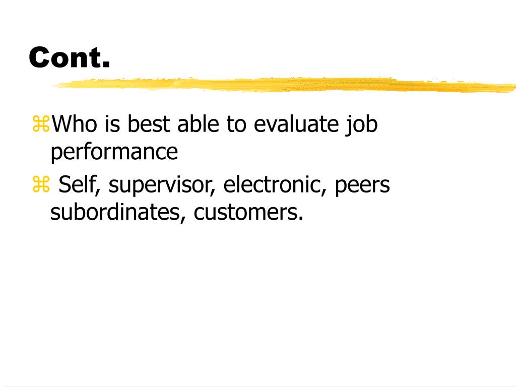 Cont. • Who is best able to evaluate job performance • Self, supervisor, electronic, peers subordinates, customers.