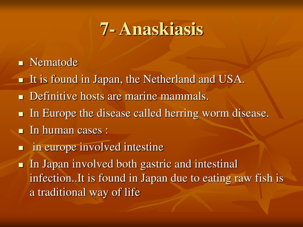 7- Anaskiasis • Nematode • It is found in Japan, the Netherland and USA. • Definitive hosts are marine mammals. • In Europe the disease called herring worm disease. • In human cases : • in europe involved intestine • In Japan involved both gastric and intestinal infection..It is found in Japan due to eating raw fish is a traditional way of life