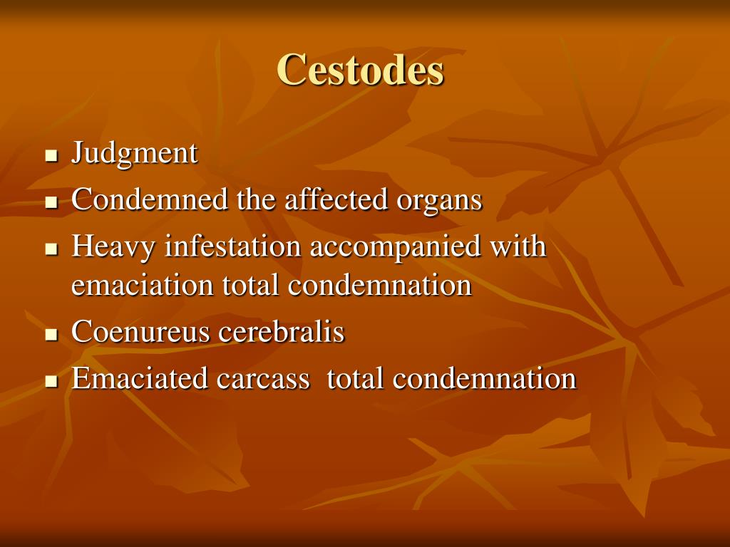 Cestodes • Judgment • Condemned the affected organs • Heavy infestation accompanied with emaciation total condemnation • Coenureus cerebralis • Emaciated carcass total condemnation