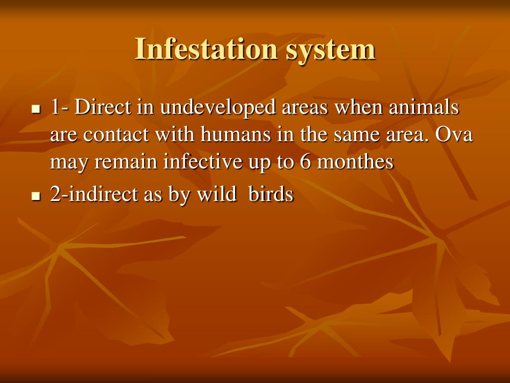 Infestation system • 1- Direct in undeveloped areas when animals are contact with humans in the same area. Ova may remain infective up to 6 monthes • 2-indirect as by wild birds
