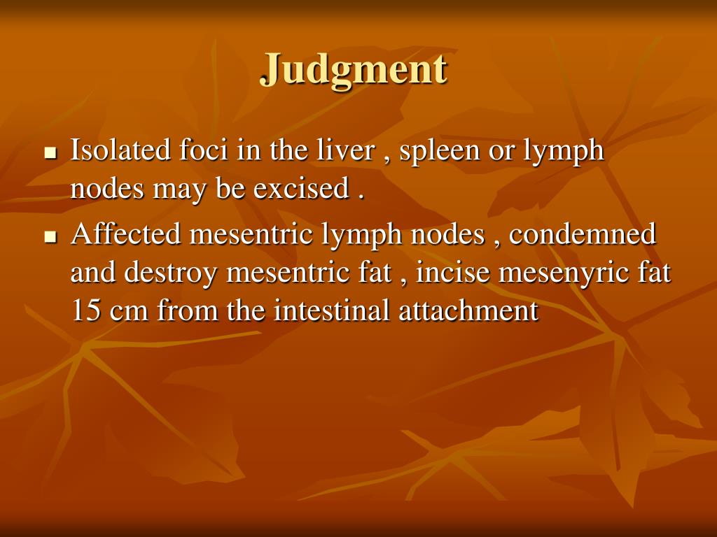 Judgment • Isolated foci in the liver , spleen or lymph nodes may be excised . • Affected mesentric lymph nodes , condemned and destroy mesentric fat , incise mesenyric fat 15 cm from the intestinal attachment