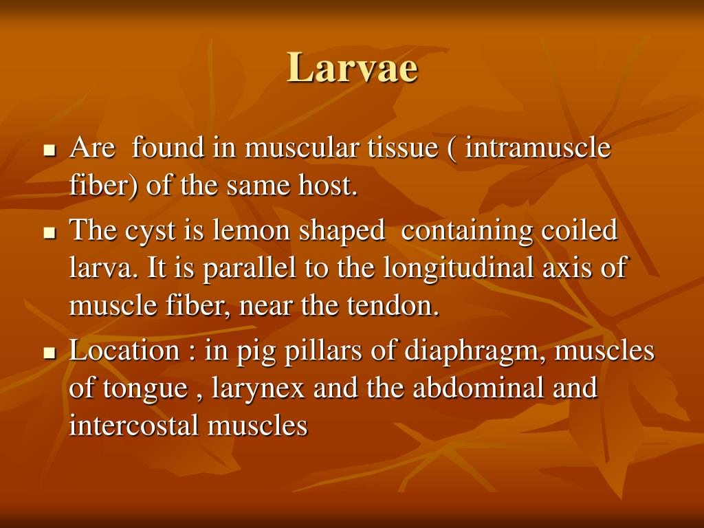 Larvae • Are found in muscular tissue ( intramuscle fiber) of the same host. • The cyst is lemon shaped containing coiled larva. It is parallel to the longitudinal axis of muscle fiber, near the tendon. • Location : in pig pillars of diaphragm, muscles of tongue , larynex and the abdominal and intercostal muscles