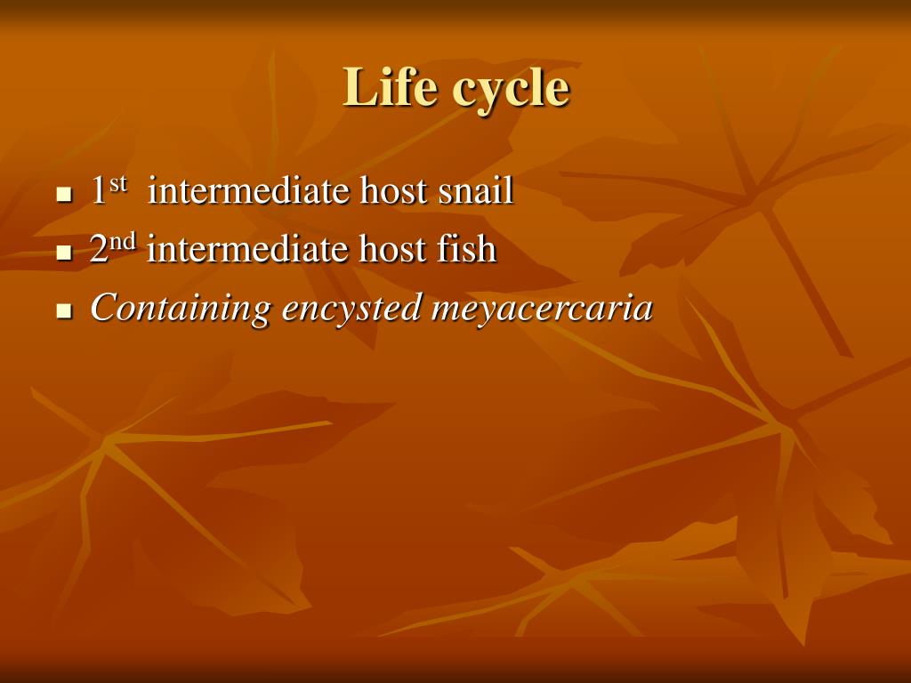Life cycle • 1st intermediate host snail • 2nd intermediate host fish • Containing encysted meyacercaria