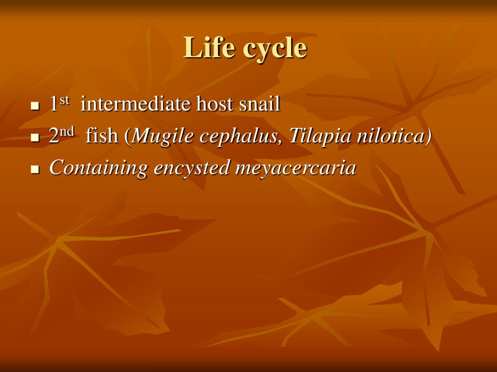Life cycle • 1st intermediate host snail • 2nd fish (Mugile cephalus, Tilapia nilotica) • Containing encysted meyacercaria