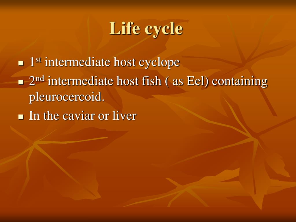 Life cycle • 1st intermediate host cyclope • 2nd intermediate host fish ( as Eel) containing pleurocercoid. • In the caviar or liver