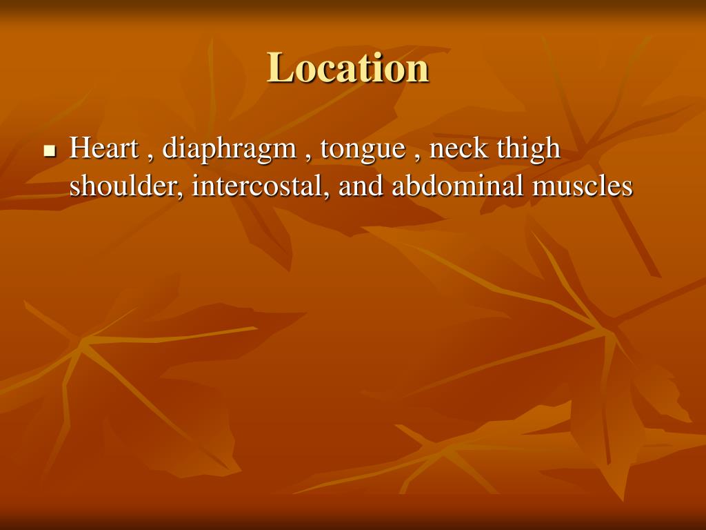 Location • Heart , diaphragm , tongue , neck thigh shoulder, intercostal, and abdominal muscles