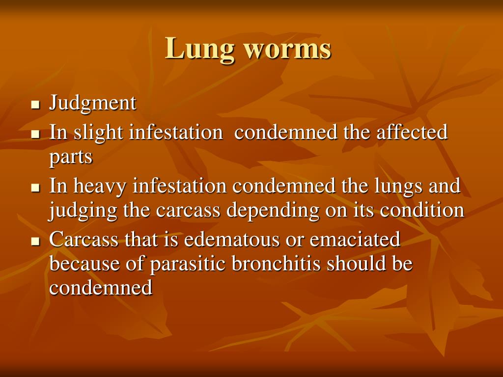 Lung worms • Judgment • In slight infestation condemned the affected parts • In heavy infestation condemned the lungs and judging the carcass depending on its condition • Carcass that is edematous or emaciated because of parasitic bronchitis should be condemned