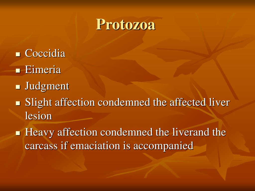 Protozoa • Coccidia • Eimeria • Judgment • Slight affection condemned the affected liver lesion • Heavy affection condemned the liverand the carcass if emaciation is accompanied