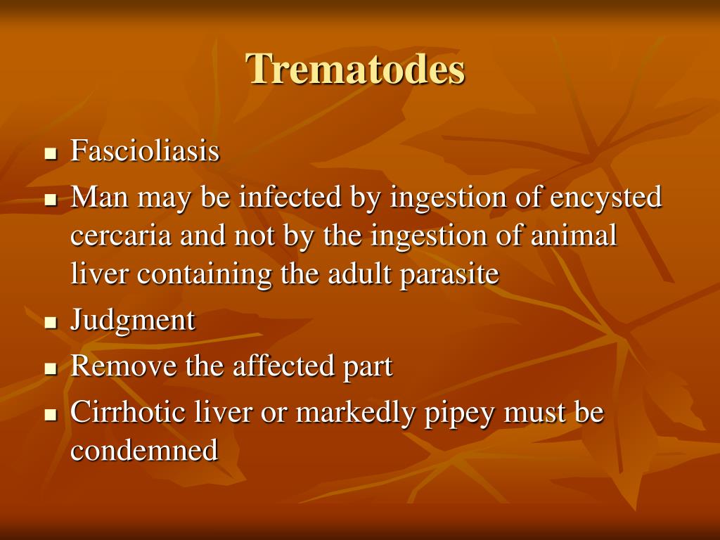 Trematodes • Fascioliasis • Man may be infected by ingestion of encysted cercaria and not by the ingestion of animal liver containing the adult parasite • Judgment • Remove the affected part • Cirrhotic liver or markedly pipey must be condemned