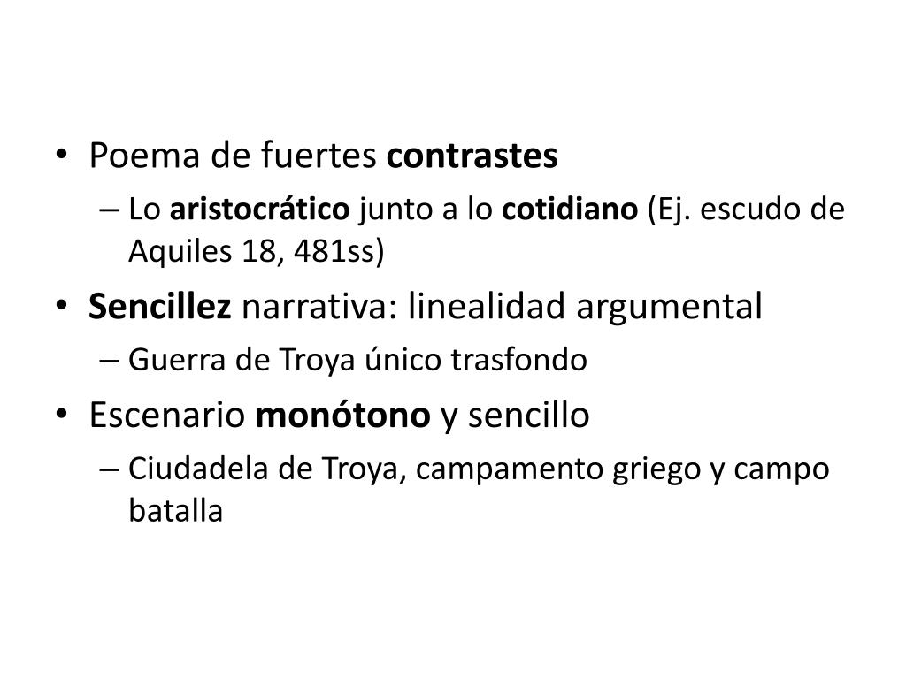 Poema de fuertes contrastes • Lo aristocrático junto a lo cotidiano (Ej. escudo de Aquiles 18, 481ss) • Sencillez narrativa: linealidad argumental • Guerra de Troya único trasfondo • Escenario monótono y sencillo • Ciudadela de Troya, campamento griego y campo batalla