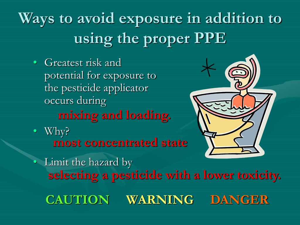 Ways to avoid exposure in addition to using the proper PPE • Greatest risk and potential for exposure to the pesticide applicator occurs during • Why? • Limit the hazard by mixing and loading. most concentrated state selecting a pesticide with a lower toxicity. CAUTIONWARNINGDANGER