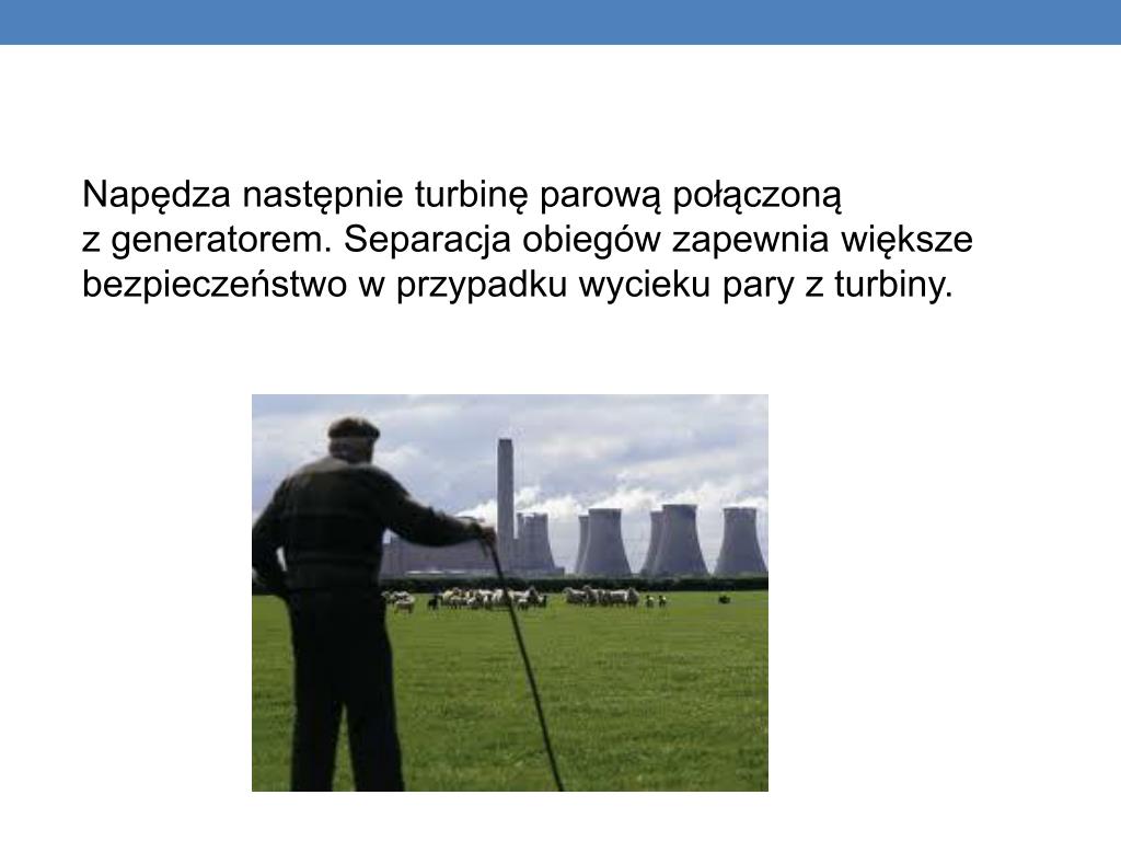 Napędza następnie turbinę parową połączoną z generatorem. Separacja obiegów zapewnia większe bezpieczeństwo w przypadku wycieku pary z turbiny.