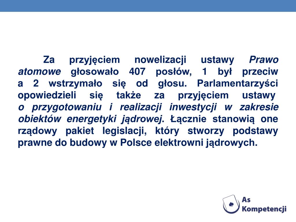 Za przyjęciem nowelizacji ustawy Prawo atomowe głosowało 407 posłów, 1 był przeciwa 2 wstrzymało się od głosu. Parlamentarzyści opowiedzieli się także za przyjęciem ustawy o przygotowaniu i realizacji inwestycji w zakresie obiektów energetyki jądrowej. Łącznie stanowią one rządowy pakiet legislacji, który stworzy podstawy prawne do budowy w Polsce elektrowni jądrowych.