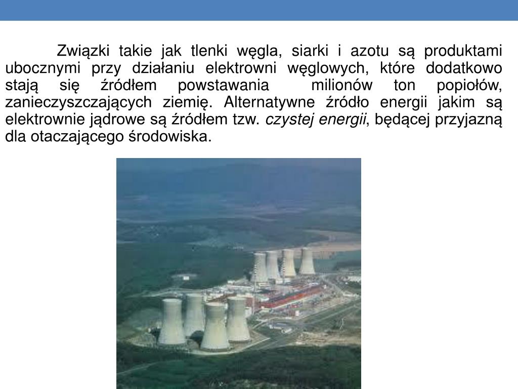 Budowa elektrowni jądrowej – za i przeciw Elektrownie jądrowe stanowią źródła energetyczne będące nieniszczącymi dla środowiska - nie powodują wydzielania tlenków węgla, siarki i azotu, które są odpowiedzialne za występowanie kwaśnych deszczy i powstawanie efektu cieplarnianego, które w konsekwencji prowadza nieuchronnie do zatrucia atmosfery ziemskiej.