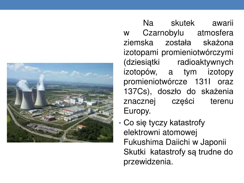 Na skutek awarii w Czarnobylu atmosfera ziemska została skażona izotopami promieniotwórczymi (dziesiątki radioaktywnych izotopów, a tym izotopy promieniotwórcze 131I oraz 137Cs), doszło do skażenia znacznej części terenu Europy. • Co się tyczy katastrofy elektrowni atomowej Fukushima Daiichi w Japonii Skutki katastrofy są trudne do przewidzenia.