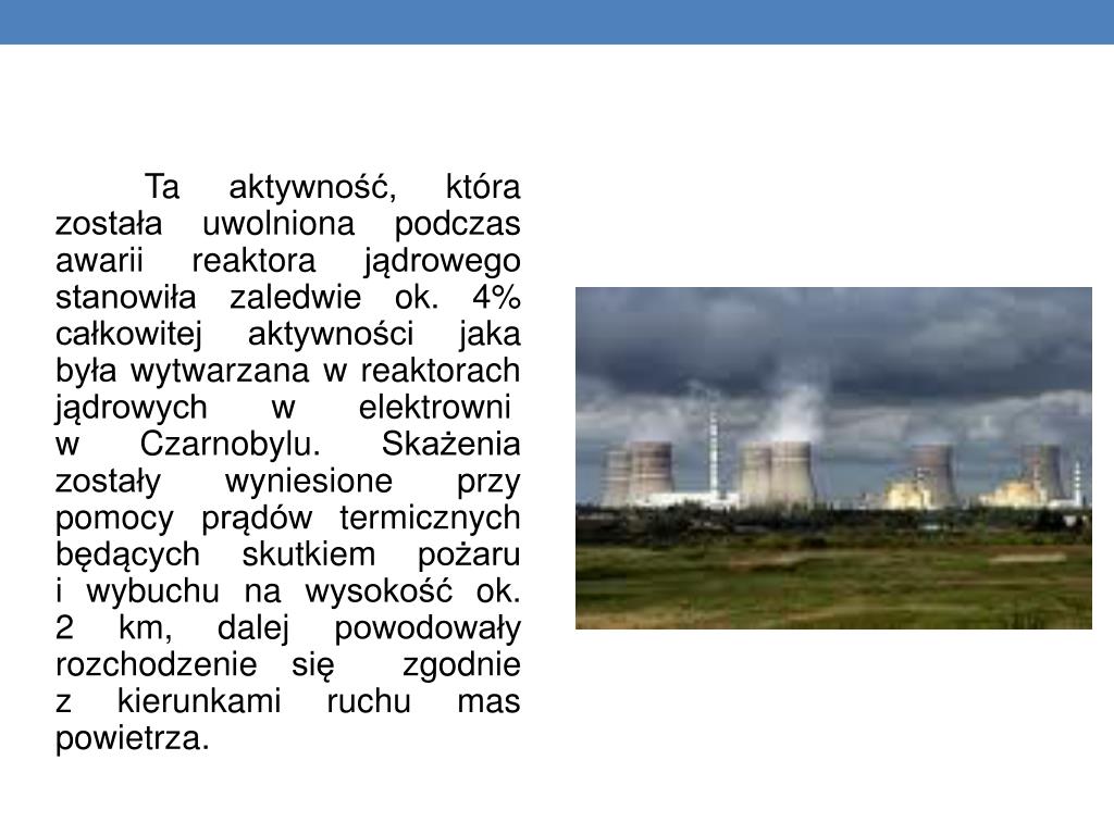 Ta aktywność, która została uwolniona podczas awarii reaktora jądrowego stanowiła zaledwie ok. 4% całkowitej aktywności jaka była wytwarzana w reaktorach jądrowych w elektrowni w Czarnobylu. Skażenia zostały wyniesione przy pomocy prądów termicznych będących skutkiem pożaru i wybuchu na wysokość ok. 2 km, dalej powodowały rozchodzenie się zgodnie z kierunkami ruchu mas powietrza.