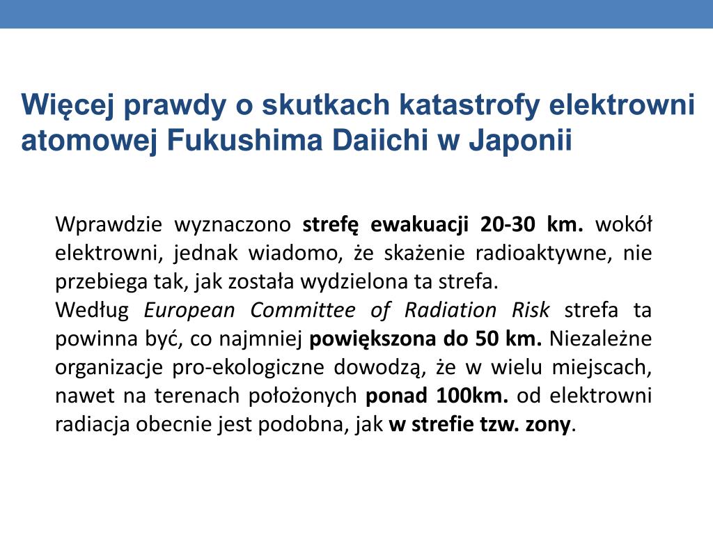 Więcej prawdy o skutkach katastrofy elektrowni atomowej Fukushima Daiichi w Japonii Wprawdzie wyznaczono strefę ewakuacji 20-30 km. wokół elektrowni, jednak wiadomo, że skażenie radioaktywne, nie przebiega tak, jak została wydzielona ta strefa. Według European Committee of Radiation Risk strefa ta powinna być, co najmniej powiększona do 50 km. Niezależne organizacje pro-ekologiczne dowodzą, że w wielu miejscach, nawet na terenach położonych ponad 100km. od elektrowni radiacja obecnie jest podobna, jak w strefie tzw. zony.
