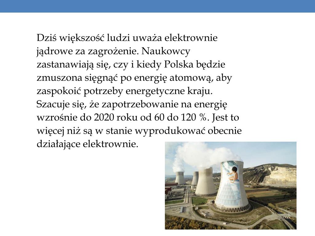 Dziś większość ludzi uważa elektrownie jądrowe za zagrożenie. Naukowcy zastanawiają się, czy i kiedy Polska będzie zmuszona sięgnąć po energię atomową, aby zaspokoić potrzeby energetyczne kraju. Szacuje się, że zapotrzebowanie na energię wzrośnie do 2020 roku od 60 do 120 %. Jest to więcej niż są w stanie wyprodukować obecnie działające elektrownie.