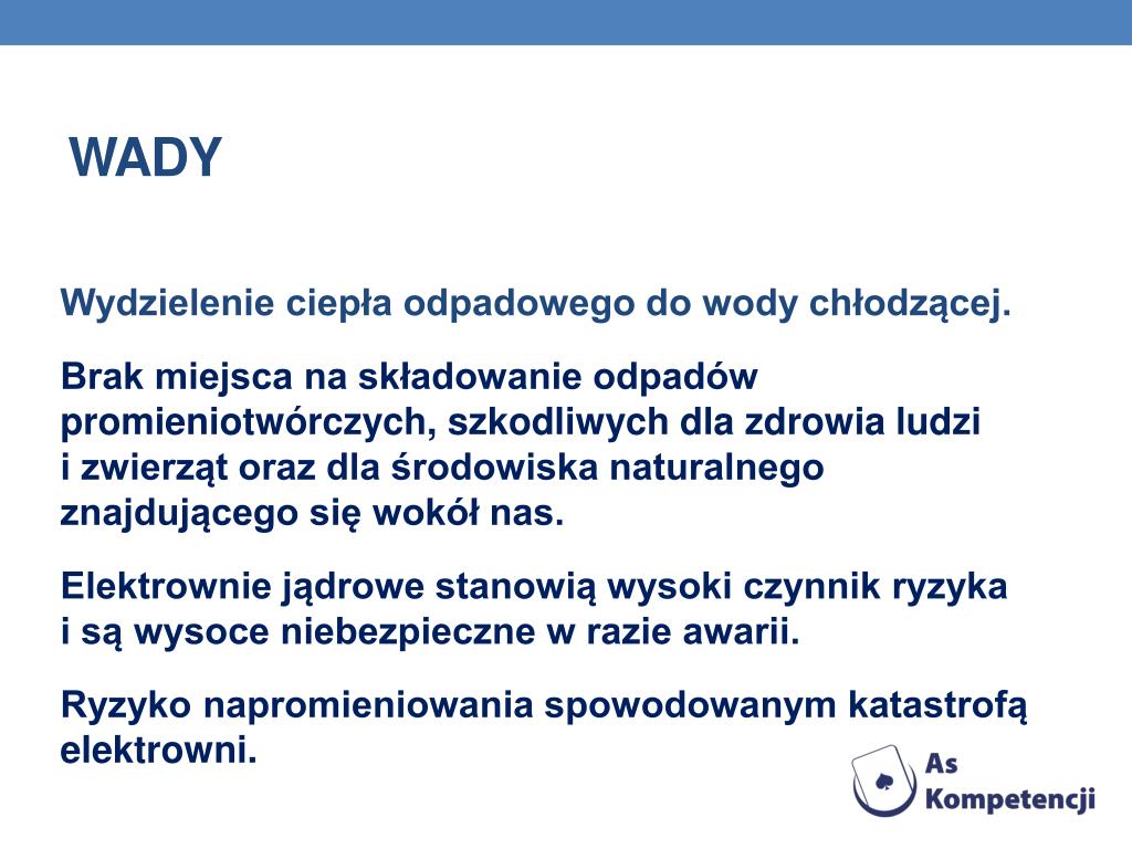 wady Wydzielenie ciepła odpadowego do wody chłodzącej. Brak miejsca na składowanie odpadów promieniotwórczych, szkodliwych dla zdrowia ludzi i zwierząt oraz dla środowiska naturalnego znajdującego się wokół nas. Elektrownie jądrowe stanowią wysoki czynnik ryzyka i są wysoce niebezpieczne w razie awarii. Ryzyko napromieniowania spowodowanym katastrofą elektrowni.