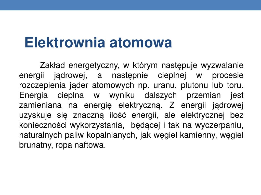 Elektrownia cieplna Obiekt przemysłowo-energetyczny (elektrownia cieplna), wytwarzający energię elektryczną poprzez wykorzystanie energii pochodzącej z rozszczepienia jąder atomów, najczęściej uranu (uranu naturalnego lub nieco wzbogaconego w izotop 235U), w której ciepło konieczne do uzyskania pary wodnej, jest otrzymywane z reaktora jądrowego.