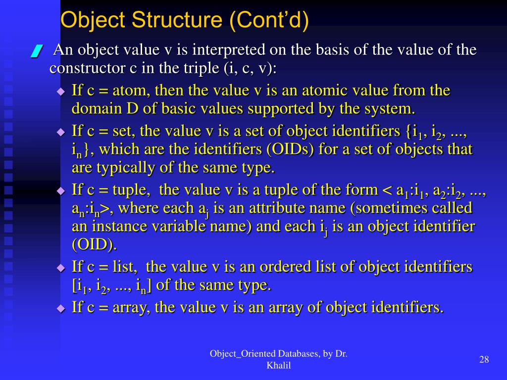 Object Structure (Cont’d) • There are the following types of constructors: • Basic constructors: atom, tuple, set. • Other constructors: list, array, bag. • The common constructor: domain D, that contains all basic atomic values that are directly available in the system. These typically include integers, real numbers, character strings, Booleans, dates, and any other data types that the system supports directly. Object_Oriented Databases, by Dr. Khalil