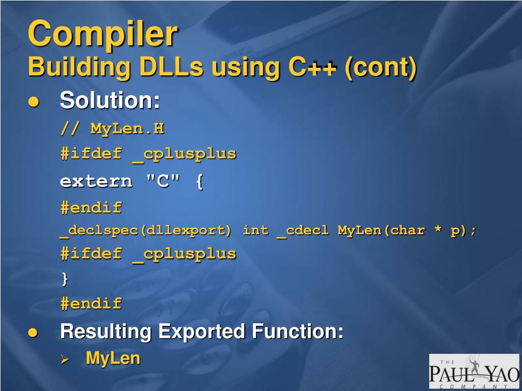 CompilerBuilding DLLs using C++ • An Include File: #include "MyLen.h" • The Source Code (MyLen.cpp): _declspec(dllexport) int _cdecl MyLen(char * p) { return 4; } • Resulting Exported Function: • ?MyLen@@YAHPAD@Z