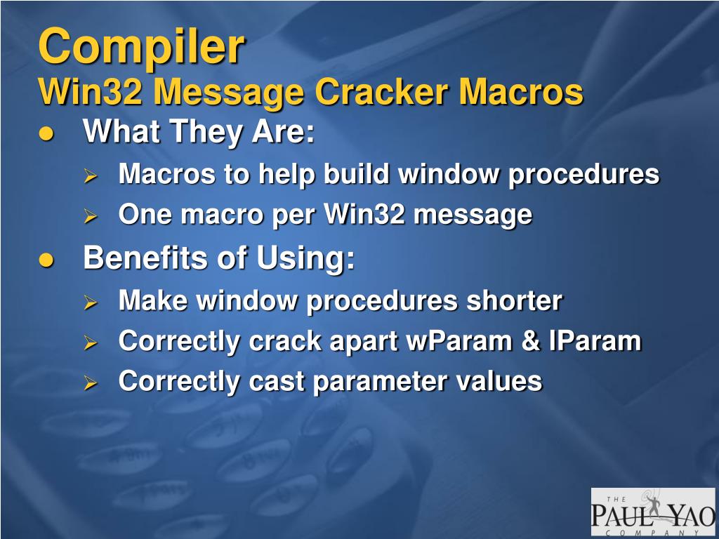 CompilerWin32 Message Cracker Macros (cont) • The definitions: • #include <windowsx.h> • A Tool: Email: info@paulyao.com For a complimentary copy