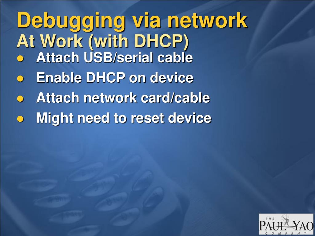 Debugging via networkAt Work (with DHCP) • Attach USB/serial cable • Enable DHCP on device • Attach network card/cable • Might need to reset device