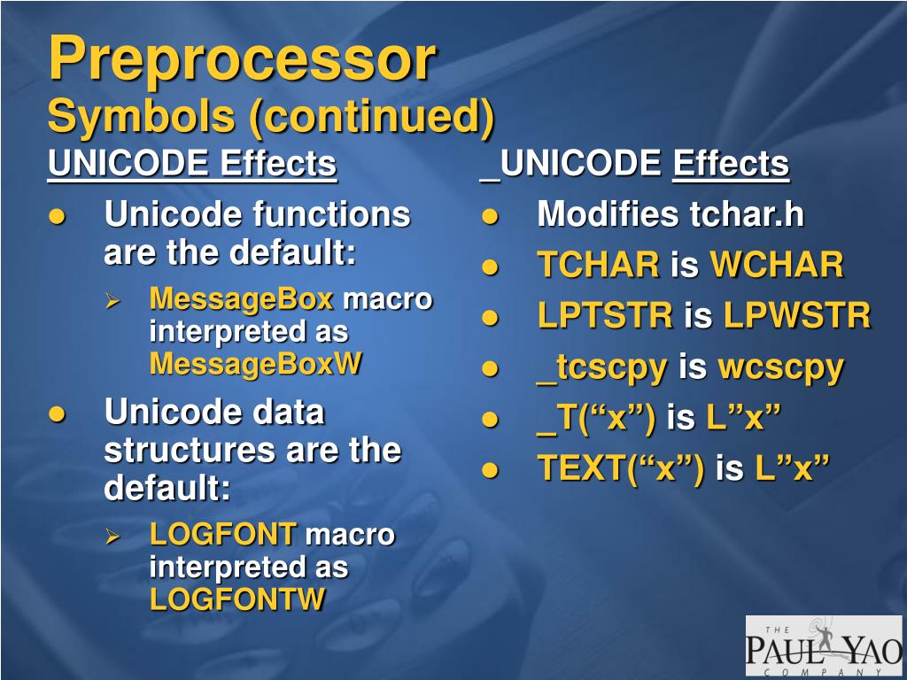 UNICODE Effects Unicode functions are the default: MessageBox macro interpreted as MessageBoxW Unicode data structures are the default: LOGFONT macro interpreted as LOGFONTW _UNICODE Effects Modifies tchar.h TCHAR is WCHAR LPTSTR is LPWSTR _tcscpy is wcscpy _T(“x”) is L”x” TEXT(“x”) is L”x” PreprocessorSymbols (continued)