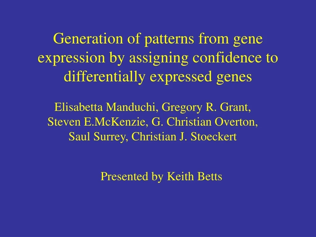 Generation of patterns from gene expression by assigning confidence to differentially expressed genes Elisabetta Manduchi, Gregory R. Grant, Steven E.McKenzie, G. Christian Overton, Saul Surrey, Christian J. Stoeckert Presented by Keith Betts