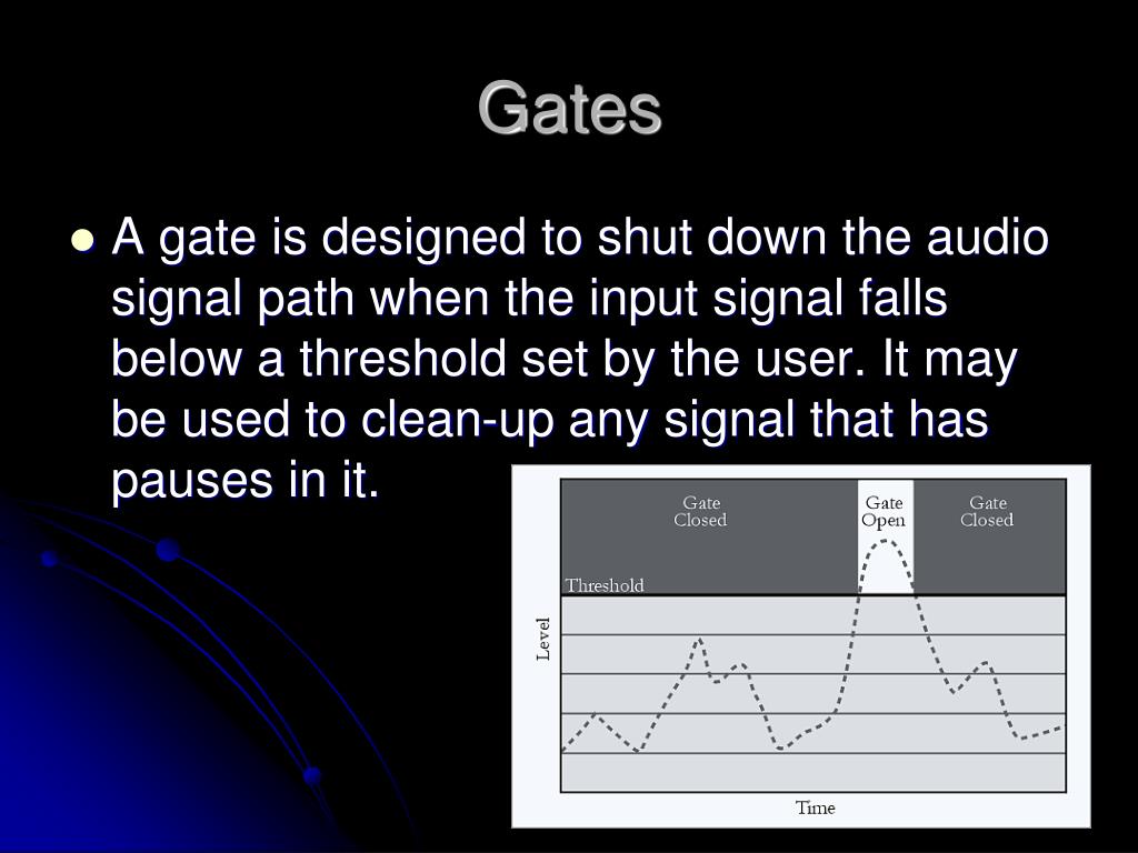 Gates • A gate is designed to shut down the audio signal path when the input signal falls below a threshold set by the user. It may be used to clean-up any signal that has pauses in it.