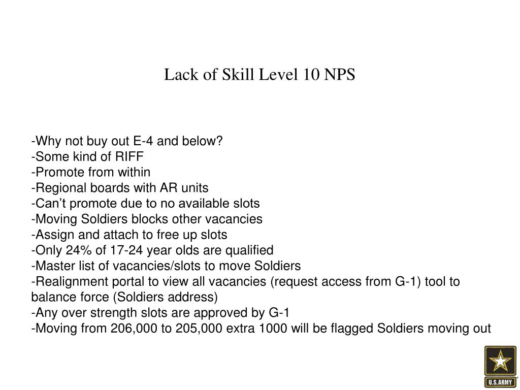 Lack of Skill Level 10 NPS -Why not buy out E-4 and below? -Some kind of RIFF -Promote from within -Regional boards with AR units -Can’t promote due to no available slots -Moving Soldiers blocks other vacancies -Assign and attach to free up slots -Only 24% of 17-24 year olds are qualified -Master list of vacancies/slots to move Soldiers -Realignment portal to view all vacancies (request access from G-1) tool to balance force (Soldiers address) -Any over strength slots are approved by G-1 -Moving from 206,000 to 205,000 extra 1000 will be flagged Soldiers moving out