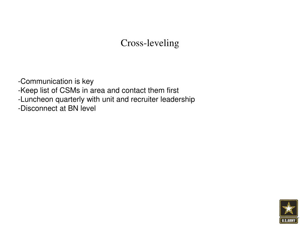 Cross-leveling -Communication is key -Keep list of CSMs in area and contact them first -Luncheon quarterly with unit and recruiter leadership -Disconnect at BN level