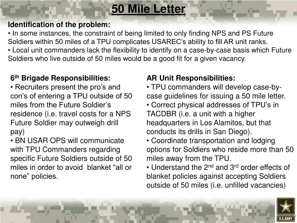50 Mile Letter • Identification of the problem: • In some instances, the constraint of being limited to only finding NPS and PS Future Soldiers within 50 miles of a TPU complicates USAREC’s ability to fill AR unit ranks. • Local unit commanders lack the flexibility to identify on a case-by-case basis which Future Soldiers who live outside of 50 miles would be a good fit for a given vacancy. • 6th Brigade Responsibilities: • Recruiters present the pro’s and con’s of entering a TPU outside of 50 miles from the Future Soldier’s residence (i.e. travel costs for a NPS Future Soldier may outweigh drill pay) • BN USAR OPS will communicate with TPU Commanders regarding specific Future Soldiers outside of 50 miles in order to avoid blanket “all or none” policies. • AR Unit Responsibilities: • TPU commanders will develop case-by-case guidelines for issuing a 50 mile letter. • Correct physical addresses of TPU’s in TACDBR (i.e. a unit with a higher headquarters in Los Alamitos, but that conducts its drills in San Diego). • Coordinate transportation and lodging options for Soldiers who reside more than 50 miles away from the TPU. • Understand the 2nd and 3rd order effects of blanket policies against accepting Soldiers outside of 50 miles (i.e. unfilled vacancies)