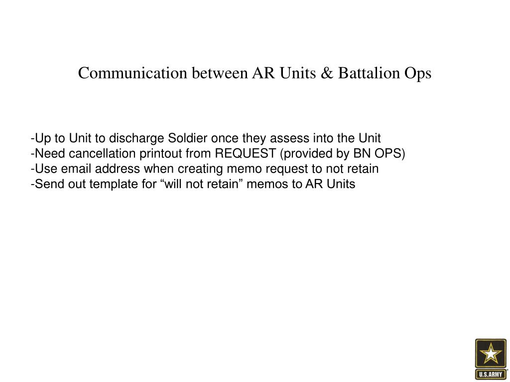 Communication between AR Units & Battalion Ops -Up to Unit to discharge Soldier once they assess into the Unit -Need cancellation printout from REQUEST (provided by BN OPS) -Use email address when creating memo request to not retain -Send out template for “will not retain” memos to AR Units
