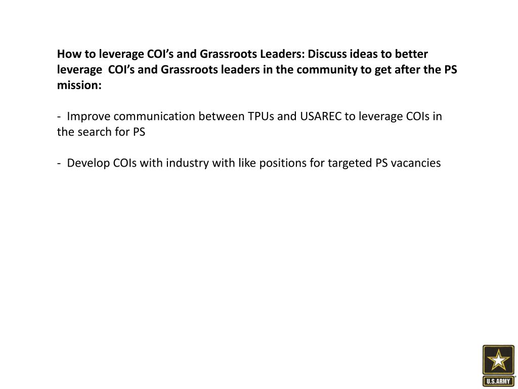 How to leverage COI’s and Grassroots Leaders: Discuss ideas to better leverage COI’s and Grassroots leaders in the community to get after the PS mission: • Improve communication between TPUs and USAREC to leverage COIs in the search for PS • Develop COIs with industry with like positions for targeted PS vacancies