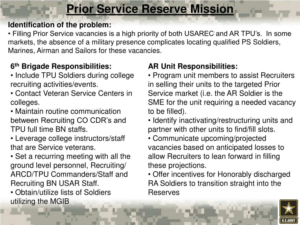 Prior Service Reserve Mission • Identification of the problem: • Filling Prior Service vacancies is a high priority of both USAREC and AR TPU’s. In some markets, the absence of a military presence complicates locating qualified PS Soldiers, Marines, Airman and Sailors for these vacancies. • 6th Brigade Responsibilities: • Include TPU Soldiers during college recruiting activities/events. • Contact Veteran Service Centers in colleges. • Maintain routine communication between Recruiting CO CDR’s and TPU full time BN staffs. • Leverage college instructors/staff that are Service veterans. • Set a recurring meeting with all the ground level personnel, Recruiting/ ARCD/TPU Commanders/Staff and Recruiting BN USAR Staff. • Obtain/utilize lists of Soldiers utilizing the MGIB • AR Unit Responsibilities: • Program unit members to assist Recruiters in selling their units to the targeted Prior Service market (i.e. the AR Soldier is the SME for the unit requiring a needed vacancy to be filled). • Identify inactivating/restructuring units and partner with other units to find/fill slots. • Communicate upcoming/projected vacancies based on anticipated losses to allow Recruiters to lean forward in filling these projections. • Offer incentives for Honorably discharged RA Soldiers to transition straight into the Reserves