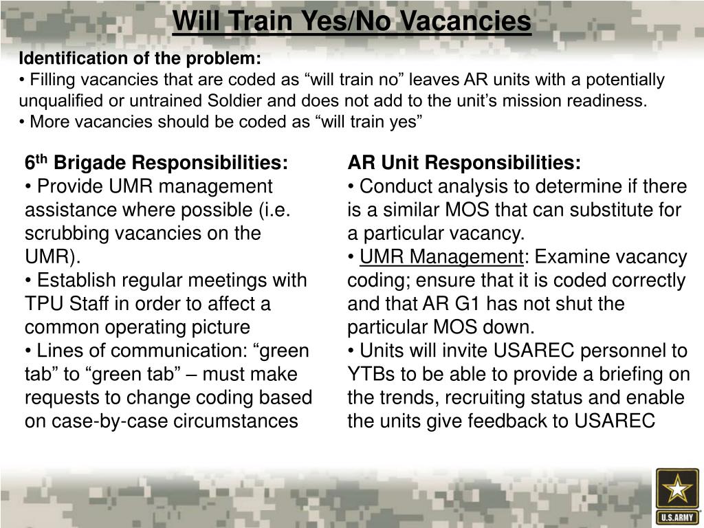 Will Train Yes/No Vacancies • Identification of the problem: • Filling vacancies that are coded as “will train no” leaves AR units with a potentially unqualified or untrained Soldier and does not add to the unit’s mission readiness. • More vacancies should be coded as “will train yes” • 6th Brigade Responsibilities: • Provide UMR management assistance where possible (i.e. scrubbing vacancies on the UMR). • Establish regular meetings with TPU Staff in order to affect a common operating picture • Lines of communication: “green tab” to “green tab” – must make requests to change coding based on case-by-case circumstances • AR Unit Responsibilities: • Conduct analysis to determine if there is a similar MOS that can substitute for a particular vacancy. • UMR Management: Examine vacancy coding; ensure that it is coded correctly and that AR G1 has not shut the particular MOS down. • Units will invite USAREC personnel to YTBs to be able to provide a briefing on the trends, recruiting status and enable the units give feedback to USAREC