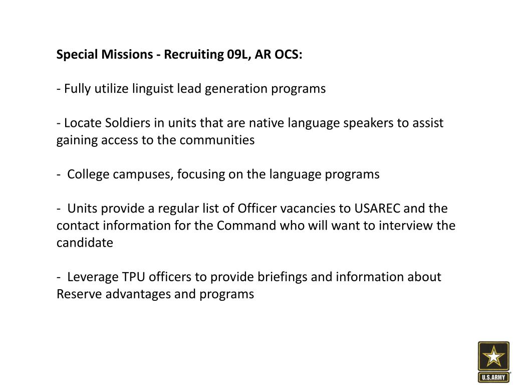 Special Missions - Recruiting 09L, AR OCS: • Fully utilize linguist lead generation programs • Locate Soldiers in units that are native language speakers to assist gaining access to the communities • College campuses, focusing on the language programs • Units provide a regular list of Officer vacancies to USAREC and the contact information for the Command who will want to interview the candidate • Leverage TPU officers to provide briefings and information about Reserve advantages and programs