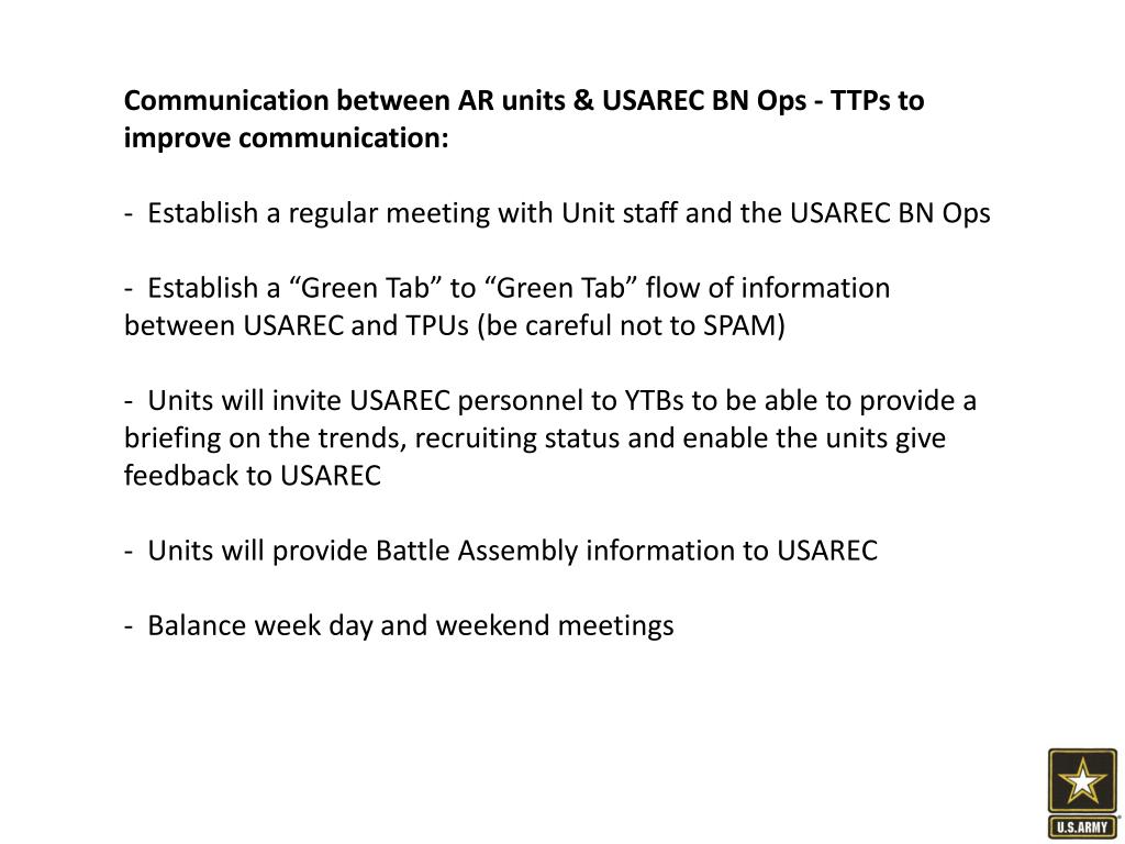 Communication between AR units & USAREC BN Ops - TTPs to improve communication: • Establish a regular meeting with Unit staff and the USAREC BN Ops • Establish a “Green Tab” to “Green Tab” flow of information between USAREC and TPUs (be careful not to SPAM) • Units will invite USAREC personnel to YTBs to be able to provide a briefing on the trends, recruiting status and enable the units give feedback to USAREC • Units will provide Battle Assembly information to USAREC • Balance week day and weekend meetings