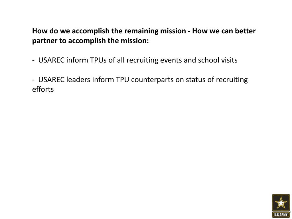 How do we accomplish the remaining mission - How we can better partner to accomplish the mission: • USAREC inform TPUs of all recruiting events and school visits • USAREC leaders inform TPU counterparts on status of recruiting efforts