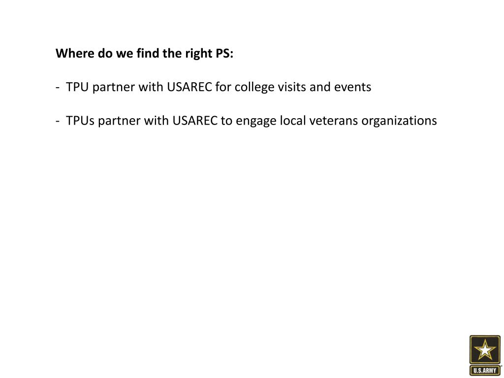 Where do we find the right PS: • TPU partner with USAREC for college visits and events • TPUs partner with USAREC to engage local veterans organizations